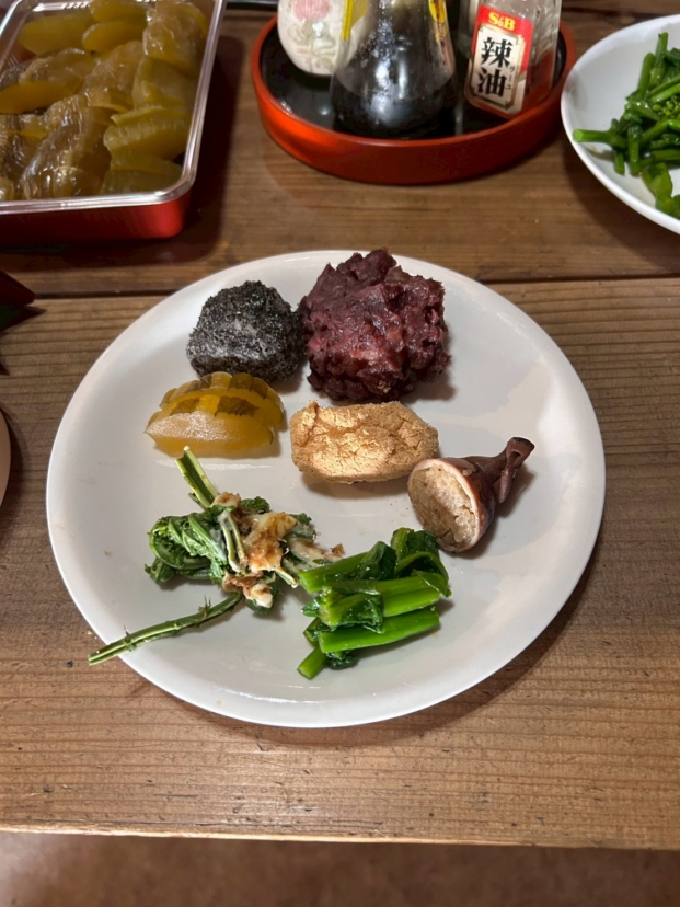 佐倉研究室からは三種牡丹餅・イカ飯を用意。地域の方々も、奈良漬けや採れたての山菜のおひたし、シイタケの醤油焼きなど、たくさんのお料理を持ち寄ってくださいました!テーブルの上は、信級の恵みでいっぱいです✨