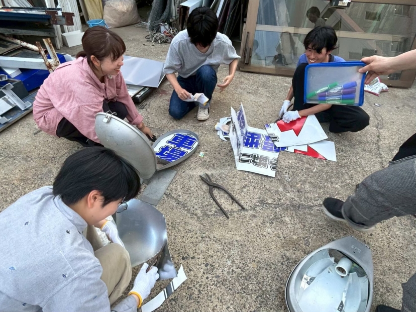 そして決まりました。金属板の看板と電球の頭を使って工作スタートです。